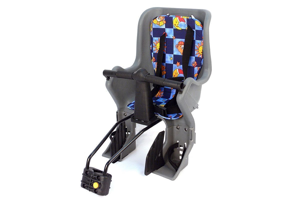 Детское кресло SF-029 LG. Конструкция крепится на вертикальную трубу рамы и рассчитана на максимальную нагрузку 20 кг, что примерно соответствует возрасту до 5 лет. Кресло имеет регулируемую высоту подножек и специальную защиту от цепи