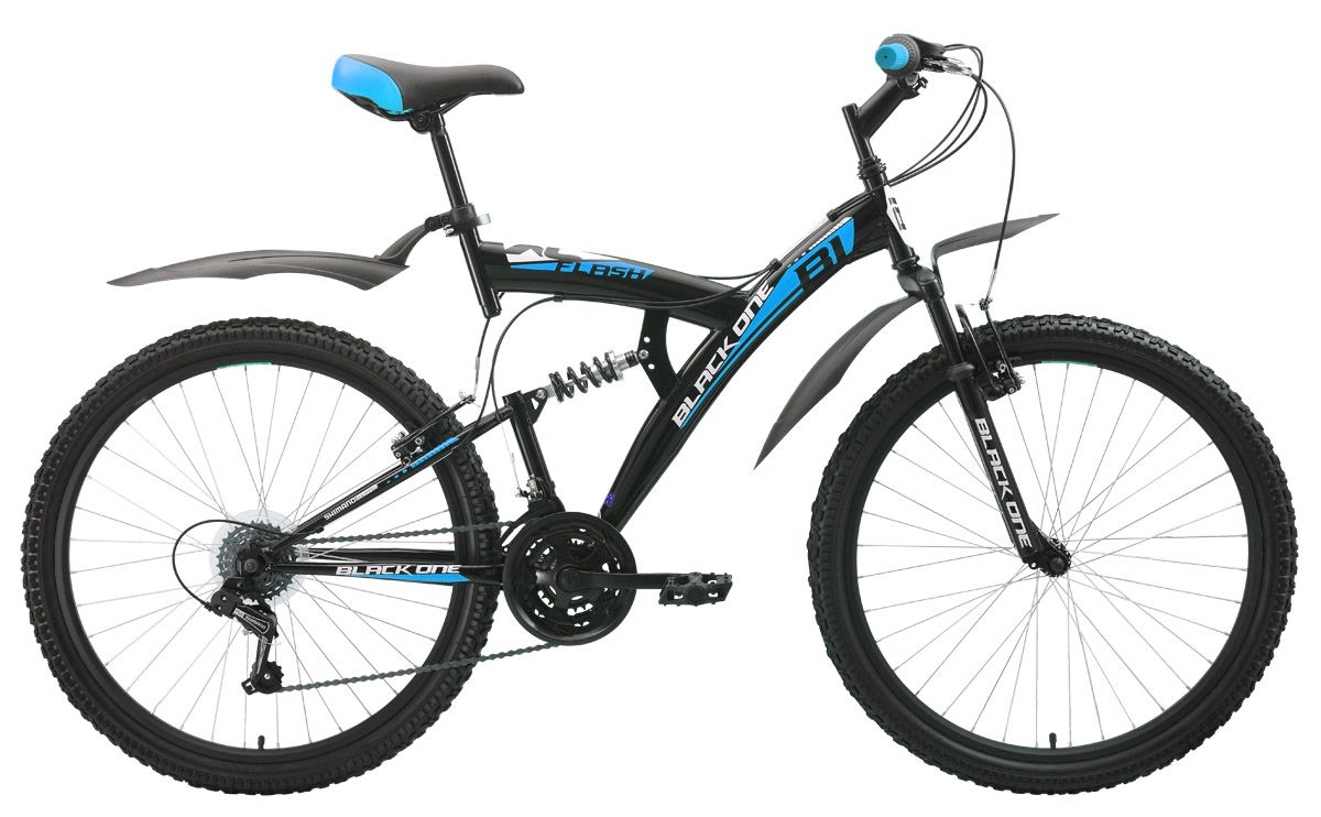 Популярный недорогой двухподвес Black One Flash на стальной раме отлично послужит Вам для покатушек на природе. Передняя и задняя подвеска отрабатывают неровности дороги и делают велопрогулки комфортными. Велосипед Black One Flash оборудован надёжными ободными тормозами. Для эксплуатации в условиях бездорожья, по грязи и снегу рекомендуется использовать вариант велосипеда с дисковым тормозом - Black One Flash Disc. Двухподвес имеет 18 передач, выбор которых, легко выполняется переключателями Shimano Revo Shift. Быстросъёмные пластиковые крылья надёжно защищают велосипедиста от случайных брызг.