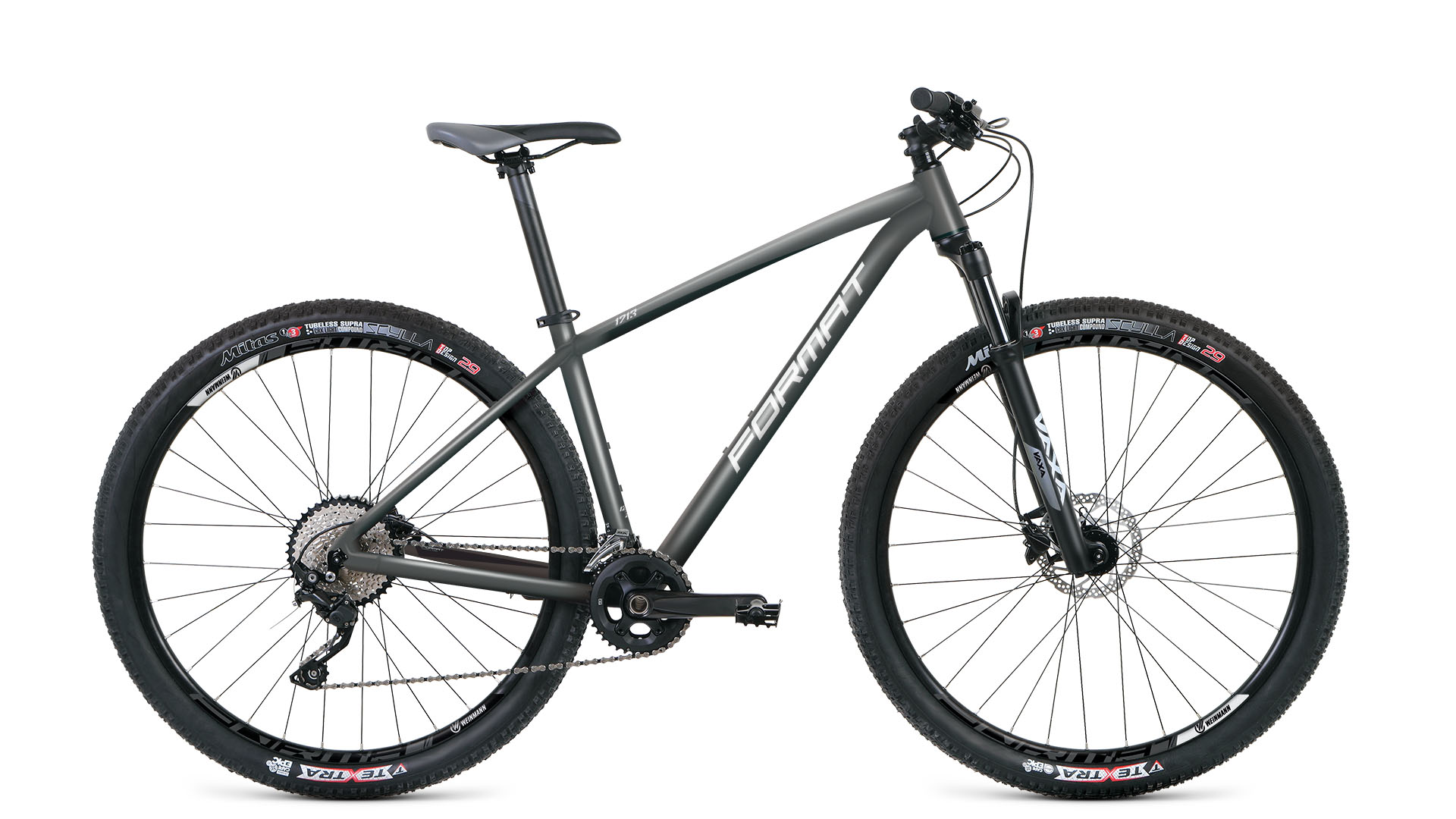 Бренд FORMAT Модель 1213 27,5 Год 2021 Ход вилки, мм 100 Вилка/регулировки Zoom VAXA 32 AIR HL/O 27.5" 100мм, воздушная, коническая, 9x100мм. Регулировка предварительной нагрузки и отскока, блокировка Обода Weinmann U28 Tubeless Ready, 32Н, Presta | Алюминиевый двустеночный Резина Mitas Scylla TEXTRA folding, 27.5x2.25" | Кевлар Тормоза Дисковые гидравлические Грипсы Format Lock-On Тормоз Tektro M275, 160/160мм Шифтеры Shimano Altus M2010 Переключатель передний Shimano Alivio M3120 Переключатель задний Shimano Deore M592, Shadow Кассета Sun Race CSM98, 11-36T, 9-Speed | 9: 11-36T Цепь KMC X9 Каретка Prowheel BB73, внешние подшипники Шатуны Prowheel RAID-501-TT, 36x22T, 170мм (S), 175мм (M-L) | 2: 36x22T Количество скоростей 18 Руль Format All Terrain, ширина: 720мм, подъём: 15мм, диаметр: 31.8мм Рулевая колонка Kenli, интегрированная, IS 42/28.6|IS 52.2/39.8 (коническая) Вынос Format All Terrain, угол: 7°, диаметр: 31.8мм, длина: 70мм Седло Format All Terrain Подседельный штырь Format, диаметр: 31.6мм, длина: 350мм Педали Алюминиевые Втулка передняя Format, пром. подшипники, 9x100мм, эксцентрик Втулка задняя Format, пром. подшипники, 10x135мм, эксцентрик -